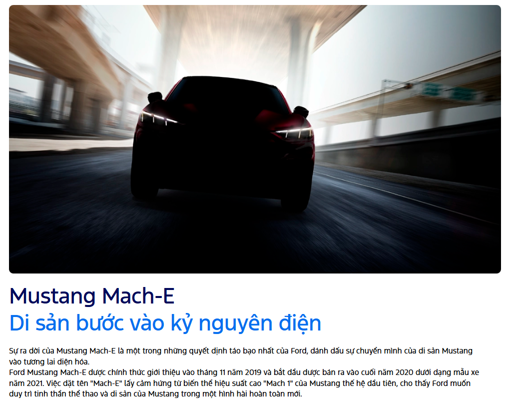 | Ngoại hình khoẻ khoắn với thiết kế vành hợp kim 19” và cùm phanh màu đỏ giúp nổi bật thiết kế thể thao của xe. | Bạn không chỉ đang lái một chiếc xe có thiết kế ngoại thất đẹp và đi cùng với đó là trải nghiệm di chuyển tiện nghi, sang trọng. Nội thất của Mach-E là mảnh ghép hoàn hảo cho lối sống và phong cách của bạn. |